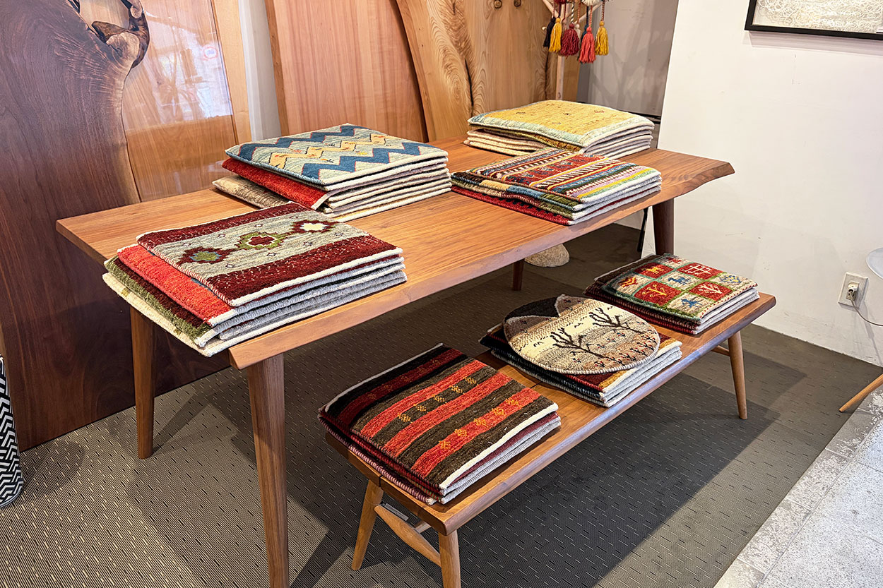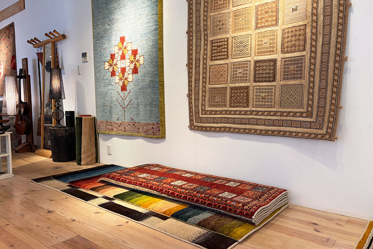 春のギャッベ展がはじまり、店内にはさまざまな表情の一枚が並んでいます。